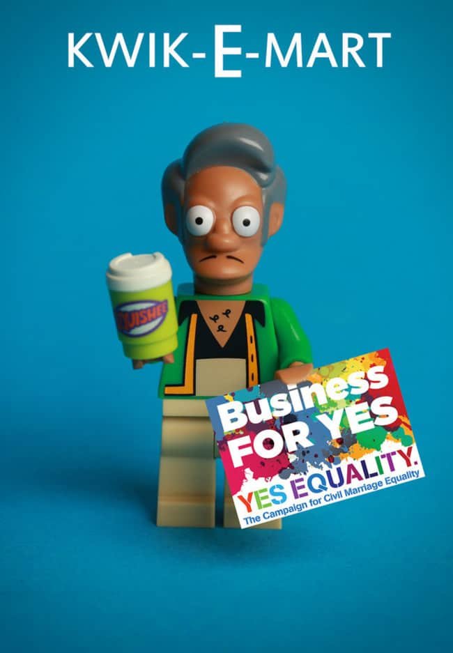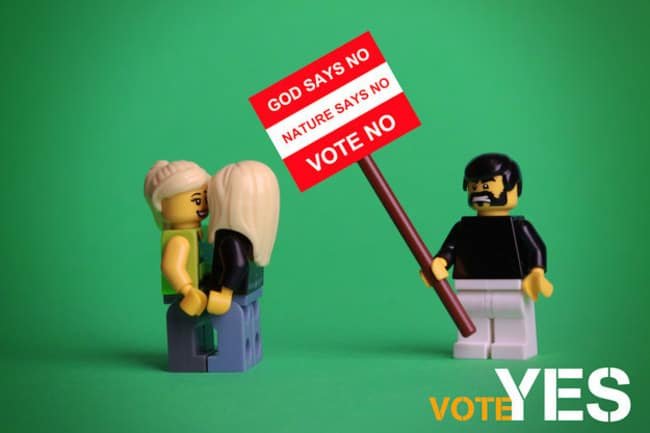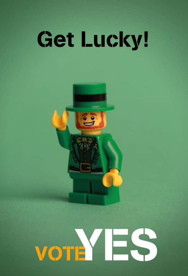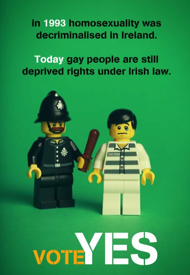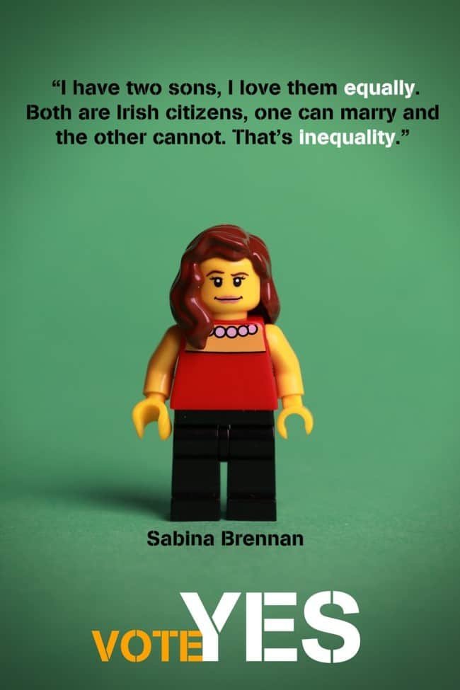 Mañana es el gran día, la jornada en que se celebrará el referendum para decidir si Irlanda será la siguiente en unirse a la lista de países que el matrimonio igualitario. Durante todos estos meses hemos visto distintas iniciativas a favor del sí, a favor de que todos los irlandeses tengan los mismos derechos. La última viene de mano de la artista Debbie Hickey, que usando los reconocibles muñecos de LEGO se ha sacado de la manga una serie de posters que nos han encantado.