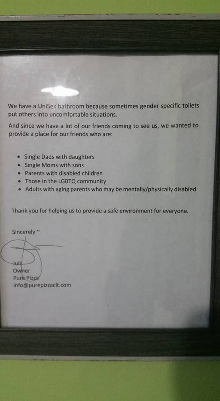 La vida no es de color blanco o de negro, y aunque hay gente que se quiera estancar en esos antiguos binomios, muchos otros entienden que el mundo está lleno de matices. Juli, la dueña de una pizzería en Charlotte (Carolina del Norte) es muy consciente de la gran diversidad de personas que van a su local, y ha tenido un bonito gesto para hacer de los baños de su pizzería un lugar inclusivo para todo el mundo: con una nota en la puerta, ha acabado con el tradicional «servicios de hombres/de mujeres», y ha invitado a todos sus clientes a que se respeten unos a otros.
