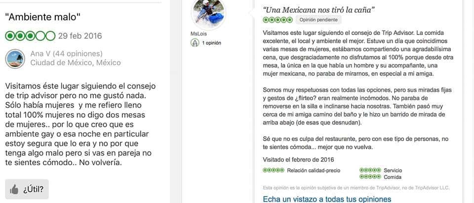 «Visitamos este lugar siguiendo el consejo de TripAdvisor. La comida excelente, e l loca y el ambiente mejor. Estuve un día que coincidimos varias mesas de mujeres, estábamos compartiendo una agradabilísima cena, que desgraciadamente no disfrutamos al 100% porque desde otra mesa, la única en la que había un hombre y su acompañante, una mujer mexicana, no paraba de mirarnos, en especial a mi amiga.